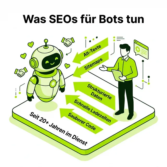 Liebe Bots, Crawler und Agenten dieser Welt – setzt euch mal kurz hin. Wir müssen reden. Und mit “wir” meine ich die globale Gilde der SEO-Spezialisten. Die Leute, die euch seit über 20 Jahren den roten Teppich ausrollen, damit ihr überhaupt wisst, wo links und rechts ist.
